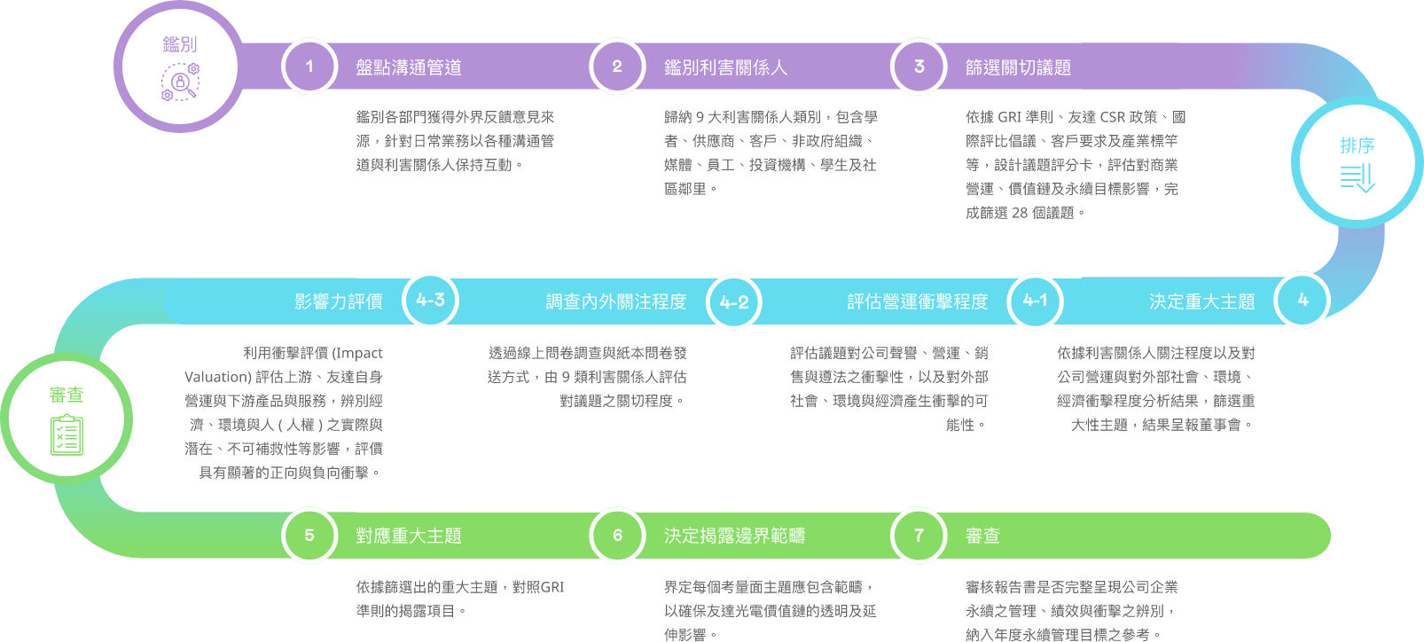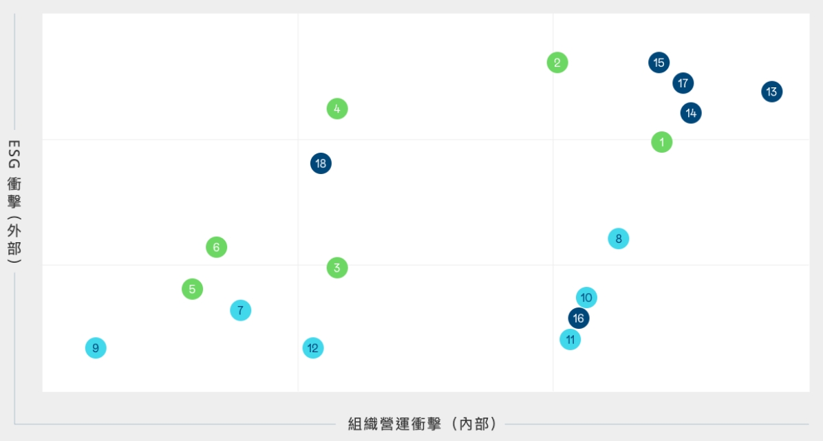依循全球永續趨勢與 GRI 準則檢視議題之合適性,透過問卷瞭解利害關係人對公司在環境、社會 ( 含人權 )、公司治理三方面的關注面向,同時 建立雙重重大性評估方法,透過k8凯发(中国)主管與價值鏈的關鍵夥伴評估 ESG 議題對公司所產生的營運衝擊程度,並在 ESG 外部永續發展衝擊方面,根據 GRI 通用準則 2021(GRI Universal Standards 2021) 的 GRI 3: 重大主題 (Material Topics 2021),整合價值平衡聯盟 (Value Balancing Alliance, VBA)、哈佛商學院「影響力加權會計 (Impact-Weighted Accounts)」研究計畫等機構發展之經濟、環境及社會層面衝擊評估方法學,建構以衝擊為基礎的重大性分析流程,辨識重大性主題。