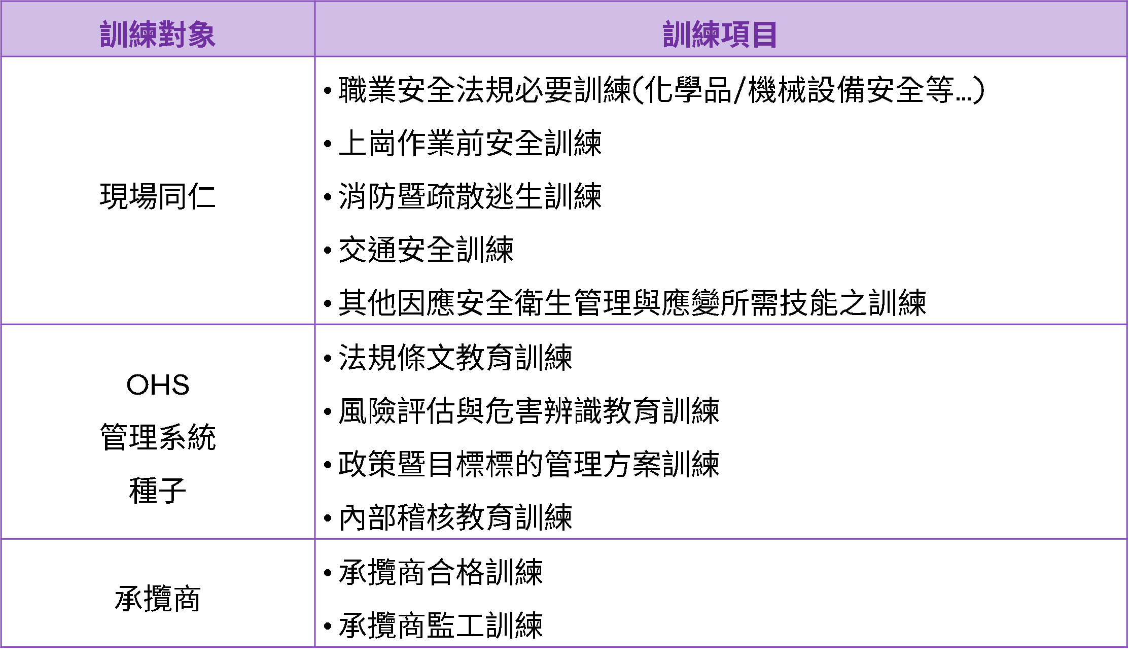 為使員工具有因應職場職安衛與其管理議題之知識和技能,提供管理系統、職業安全與衛生、消防/緊急應變相關面項之必要訓練,並有效運用資源,使員工之成長與企業永續發展目標相結合。