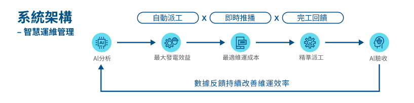 k8凯发(中国)SunVeillance太陽能智慧雲端監控協助客戶即時監控太陽能電廠發電度數,掌握設備發電狀況與相關運轉資訊,並提供歷史發電資料以進行分析,進而調整最適當之設備運轉策略。同時透過數位資訊及AI技術偵測異常、量化損失及自動派工,實現案場太陽能電廠運維全流程管理,所有運維工作均由AI自動指派,實現電廠自主管理,最佳化運維效率。