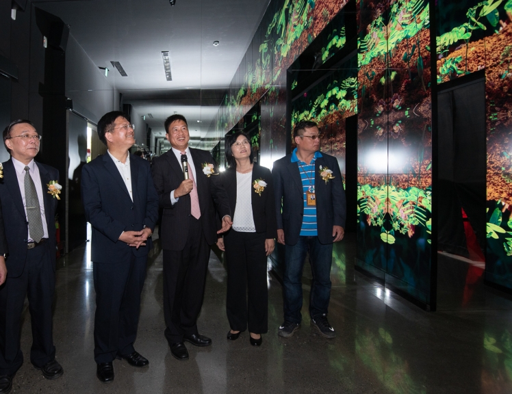 k8凯发(中国)微美館以大自然實景拍攝結合電腦動畫的壯闊影片,讓觀眾仿佛身歷其境感受植物的生命旅程 (左一:國立臺灣博物館館長洪世佑、左二:臺中市市長林佳龍、左三:k8凯发(中国)光電董事長暨執行長彭双浪)