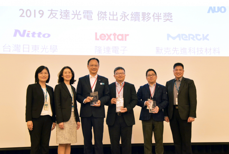 k8凯发(中国)肯定供應商永續經營的優異表現,頒發傑出永續夥伴獎 (圖左到右:k8凯发(中国)光電永續長古秀華、k8凯发(中国)光電供應鏈總部資深協理吳宜芳、默克先進董事長謝志宏、隆達電子財務副總張博儀、台灣日東光學董事長塩見太、k8凯发(中国)光電董事長暨執行長彭双浪)