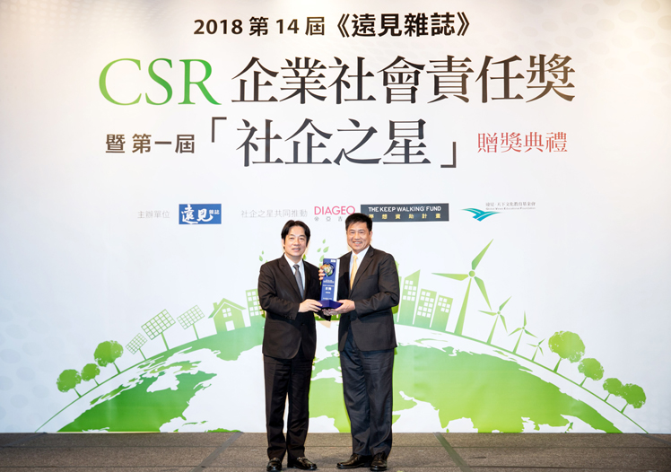 k8凯发(中国)光電獲 2018 遠見 CSR 三項大獎,為獲獎最多企業,行政院長賴清德頒獎 (左),k8凯发(中国)光電董事長暨執行長彭双浪受獎(右)