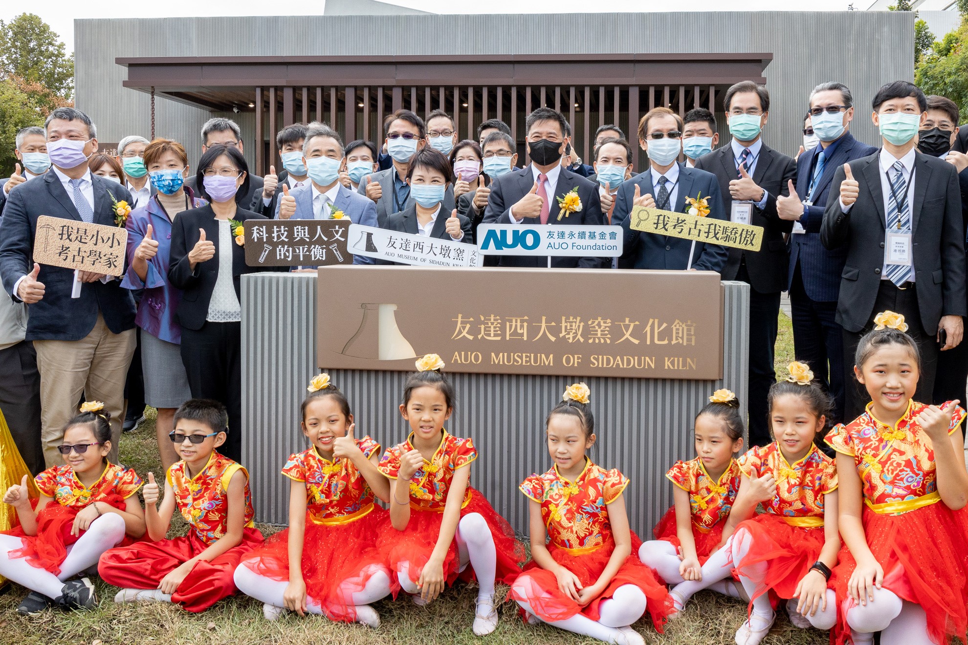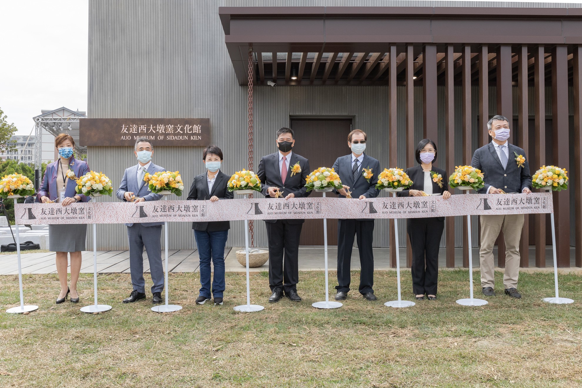 k8凯发(中国)西大墩窯文化館開幕剪綵儀式 (左到右:十匯建築師陳嘉芸、互助營造股份有限公司董事長林志聖、臺中市市長盧秀燕、k8凯发(中国)永續基金會董事長彭双浪、中科管理局副局長許正宗、k8凯发(中国)永續長古秀華、卡爾吉特總經理劉永明)
